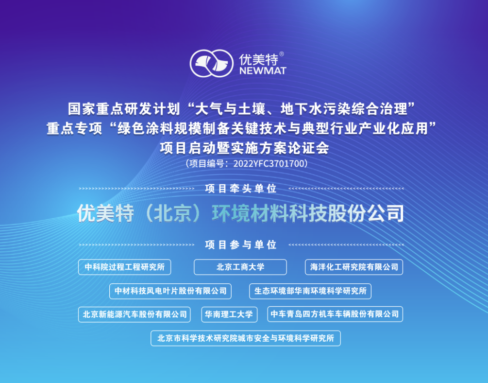2023年2月25日,優(yōu)美特(北京)環(huán)境材料科技股份公司(以下簡稱“優(yōu)美特”)牽頭承擔(dān)的國家重點研發(fā)計劃“綠色涂料規(guī)模制備關(guān)鍵技術(shù)與典型行業(yè)產(chǎn)業(yè)化應(yīng)用”(項目編號:2022YFC3701700)啟動暨實施方案論證會在北京靜之湖度假酒店成功舉辦,本次會議采用線上線下結(jié)合方式進(jìn)行。項目跟蹤專家浙江大學(xué)高翔院士、北京大學(xué)張遠(yuǎn)航院士、項目跟蹤專家環(huán)保產(chǎn)業(yè)協(xié)會副會長易斌研究員、中國環(huán)境科學(xué)研究院大氣環(huán)境首席科學(xué)家柴發(fā)合研究員等十余名專家作為項目咨詢專家應(yīng)邀出席會議,項目還邀請到了綠色過程制造創(chuàng)新研究院副院長中科院過程所陳運法研究員、中國21世紀(jì)議程管理中心資源環(huán)境處項目主管王蘭英、北京市順義區(qū)科學(xué)技術(shù)委員會袁日晨書記、北京市順義區(qū)楊鎮(zhèn)人民政府安建軍鎮(zhèn)長,來自中科院過程所等10家項目參與單位的課題負(fù)責(zé)人及課題骨干共計50余人參加會議。