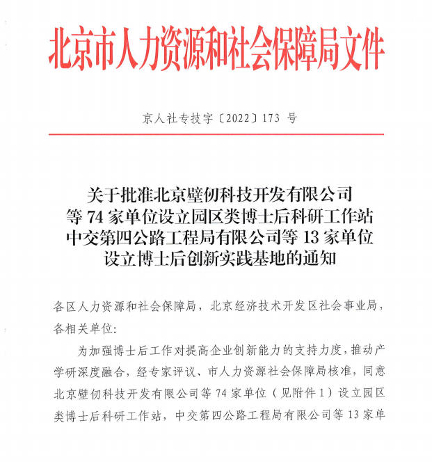 近日,北京市人力資源和社會(huì)保障局下發(fā)《關(guān)于批準(zhǔn)北京壁仞科技開發(fā)有限公司等74家單位設(shè)立園區(qū)類博士后科研工作站中交第四公路工程局有限公司等 13 家單位設(shè)立博士后創(chuàng)新實(shí)踐基地的通知》(京人社專技字〔2022〕173號(hào)),優(yōu)美特(北京)環(huán)境材料科技股份公司(以下簡(jiǎn)稱“優(yōu)美特公司”)獲批中關(guān)村科技園區(qū)順義園分站博士后工作站,標(biāo)志著優(yōu)美特公司“人才強(qiáng)企、技術(shù)強(qiáng)企”環(huán)境營(yíng)造創(chuàng)建邁向新的臺(tái)階。