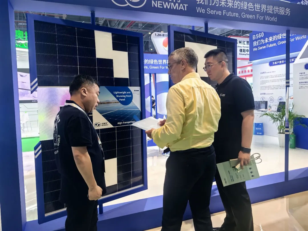 本次展會(huì)中,優(yōu)美特重磅推出的輕質(zhì)高透炫彩光伏前板成為展位焦點(diǎn)。該產(chǎn)品突破了傳統(tǒng)光伏組件的單一外觀,采用結(jié)構(gòu)色納米填料技術(shù),在保持高可見光透過率(>90%)的同時(shí),實(shí)現(xiàn)前板顏色隨光線角度變化而變幻的獨(dú)特視覺效果,兼具美觀與性能,吸引眾多行業(yè)內(nèi)及海內(nèi)外代表駐足交流。